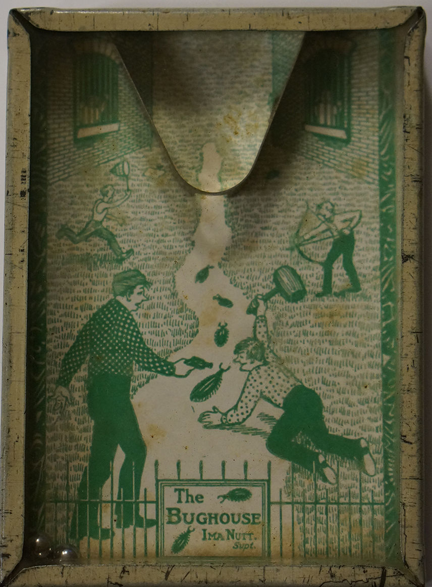 One thing is clear about the art on these vintage games: They’re enthusiastically not educational. While the cheap plastic versions of both styles were ubiquitous when I was a kid in the 70s, it was the handheld baseball toy used by NYC detective Mark McPherson to calm his nerves throughout the classic 1944 film Laura that first showed me how cool-looking the toy used to be. Search for “vintage dexterity toy” on eBay or Etsy and you’ll find dozens of examples. I was delighted when I found “The Bughouse” decades ago, because the one-color art was crude, and the vulgar “Ima Nutt” was a touch that would never be included on a kid’s game in my lifetime.