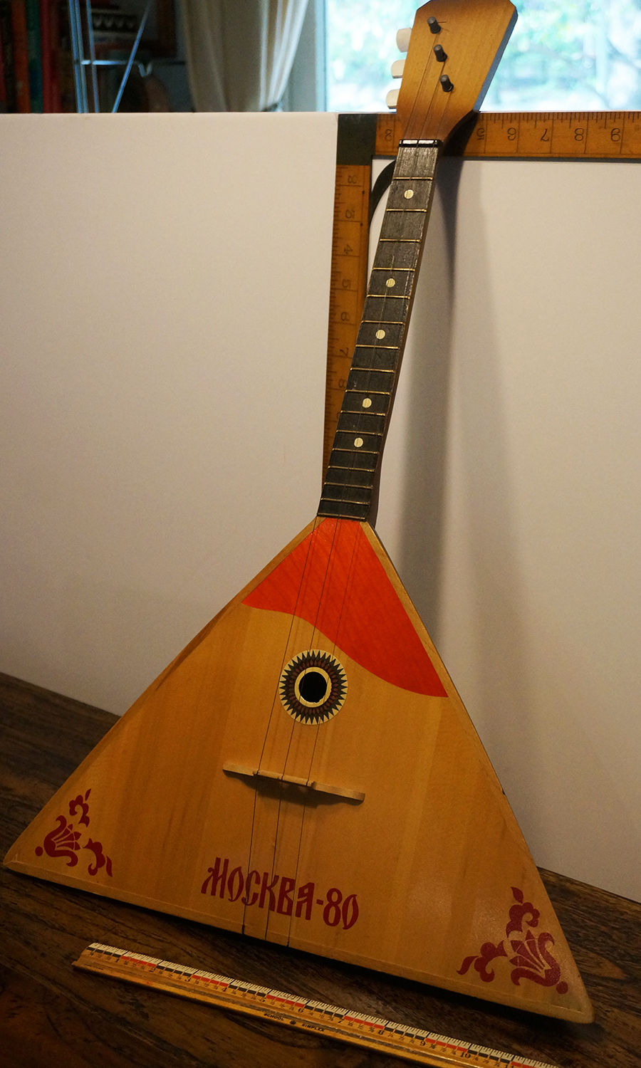 The musician who bought it told me the workmanship was first rate, and he plans to go to his local guitar shop and buy a better set of strings so he can play it without hurting his fingers. He didn’t mind that it had “MOCKBA-80” painted on the soundboard, and we’re glad that he doesn’t intend to paint over it.