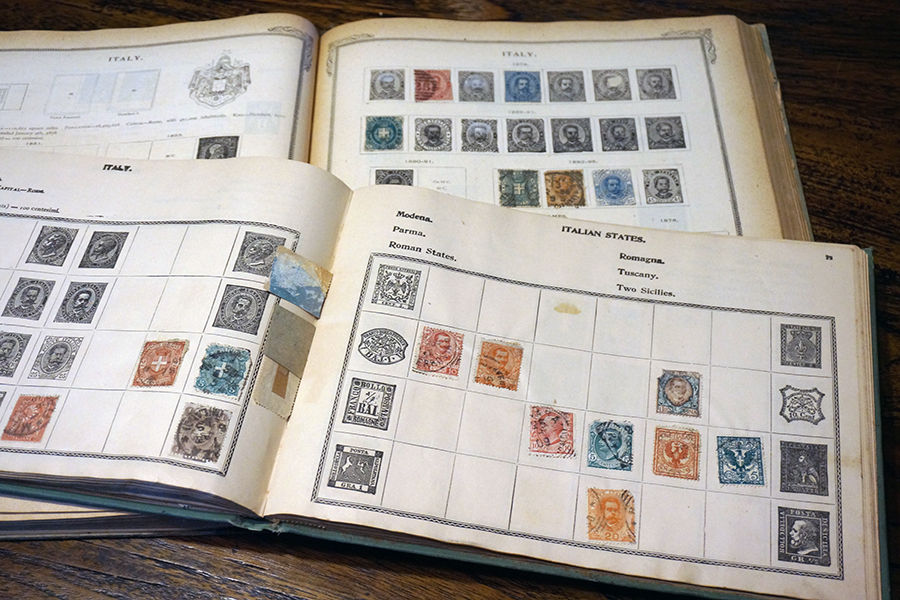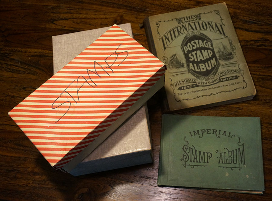 We love books but know we aren’t going to get Bookfinder prices at a flea market, so we seldom spend time at estate sales poring over shelves. This sale was different, since I knew that anything we left behind would likely wind up in a dumpster. On the first pass, I snagged The International Postage Stamp Album from 1897 and an oblong book called Imperial Stamp Album. I paused long enough to make sure there were a few stamps pasted inside before scooping them up and allowing my mind to wander to radio shows and short stories in which bazillion-dollar stamps were critical plot points.
