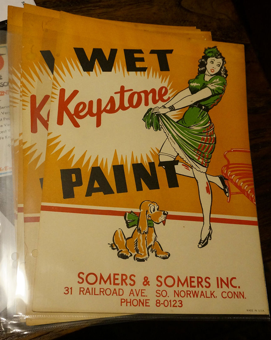 Finding multiple copies of a single piece of ephemera rarely happens. It’s even more unusual to find posters on uncoated paper on which the colors haven’t faded with time. We lucked out on both counts with these delightful WET PAINT signs. Keystone Gal only made it to a couple Sundays before selling out. I wish I’d saved one!